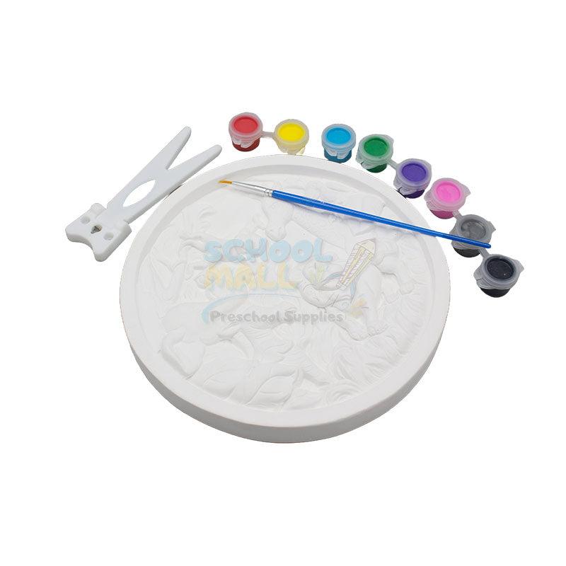 Box Include: 8 Water Colors, 1 Brushes, 1 Stand, 1 Gypsum Painting