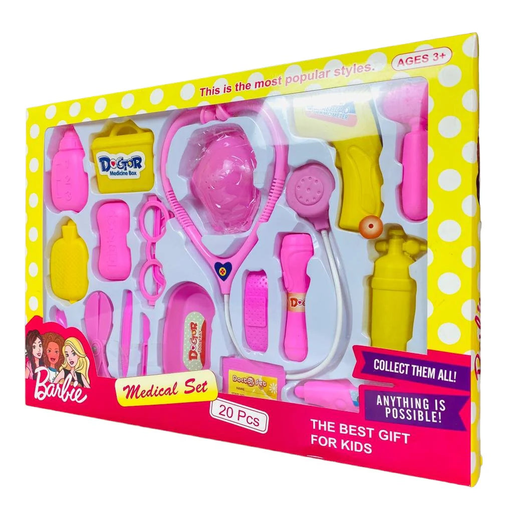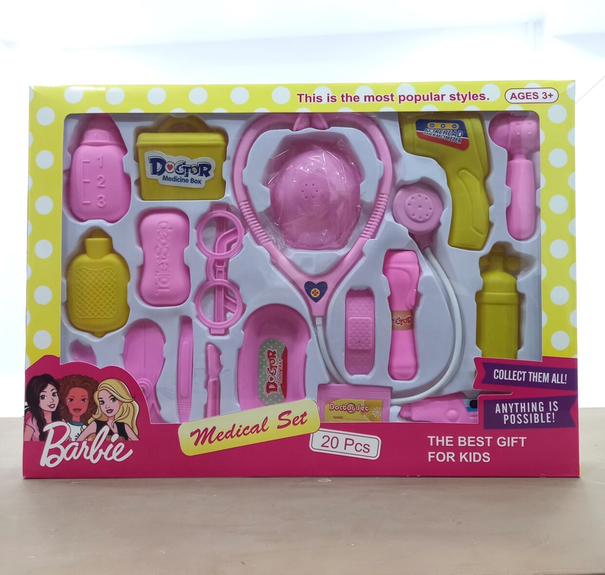 Introducing the Barbie Kid Medical Set! Your little ones can now imagine and play out their dream careers as a doctor or nurse with this exciting and interactive toy set. The set includes all the necessary tools and accessories for a realistic role-playing experience.The Barbie Kid Medical Set comes with a Barbie doll dressed in a cute and professional doctor’s outfit, complete with a white coat and stethoscope. The set also includes a patient bed with a removable blanket, an examination table, a blood pressure monitor, a thermometer, an otoscope, and a syringe.Your kids can have hours of fun imagining and treating their patients with this comprehensive medical set. The realistic medical tools and accessories inspire creative and imaginative play, encouraging kids to explore different career paths and develop problem-solving skills. The Barbie Kid Medical Set is made with high-quality materials and is designed to be durable and long-lasting, ensuring that your kids can play with it for years to come. This toy set is recommended for kids 3 years and up and is sure to be a hit with any little ones who love dolls, medical play, or imaginative role-playing games.Get your kids ready to save the day with the Barbie Kid Medical Set and start their journey to becoming a doctor or nurse today!