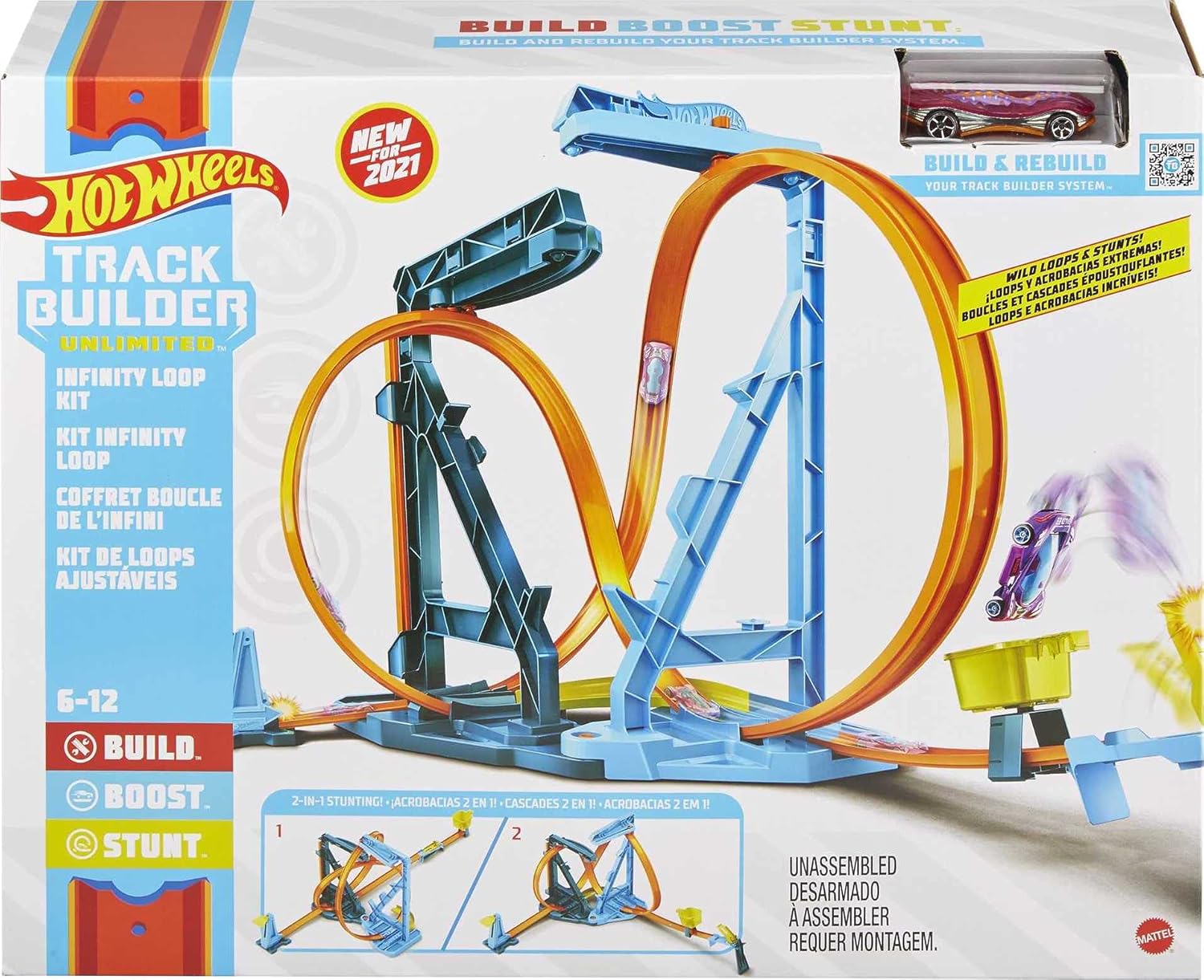 Hot Wheels Track GVG10 Builder Unlimited Infinity Loop Kit is one of the eye catching product for Kids. Hot Wheels is very famous for its Cars, Games and tracksProduct Features:The Hot Wheels Track Builder Unlimited Infinity Loop Kit features amazing track transformations by simply adjusting the loop to change the intensity of the course. This infinity loop expands quickly and easily without having to initiate an entirely new build. The versatile setup allows for either front or back flips from the jump, enhancing the levels of difficulty. Kids experiment with force as they use the stand launcher to send their vehicles into the loop, over the jump, and ultimately into the catch cup. The loop kit includes one 1:64 die-cast car as well as an extended track for a full-stunting experience. It also connects to other Hot Wheels Track Builder sets (sold separately). Kids 6 to 12 years old will have hours of fun developing their track for the most excitement and showing off their racing techniques.