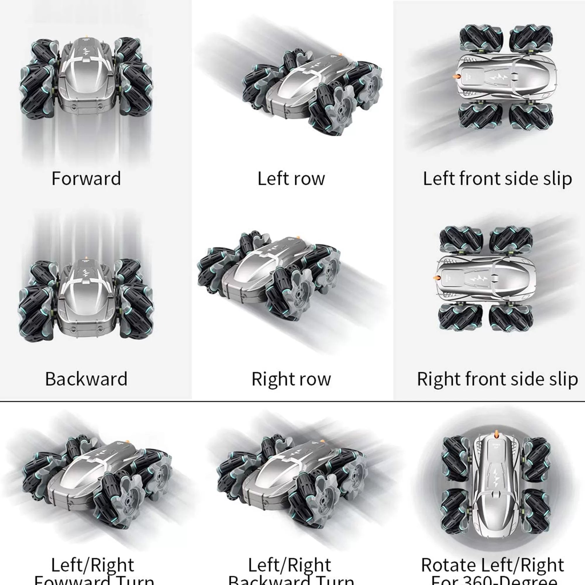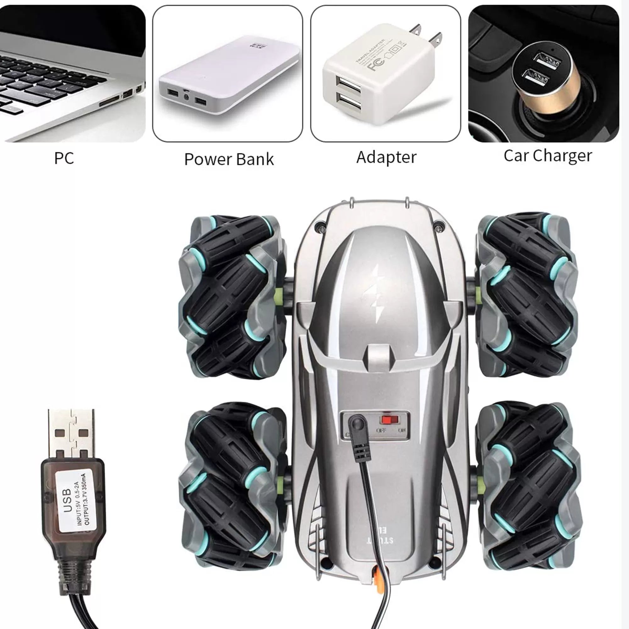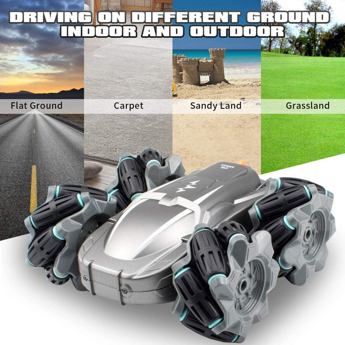 360degree Rotation Drift Stunt ELF,Rechargeable Electronic Vehicle with Cool Lights,High Speed,Flexible Steering,Anti-interference 4WD RC Car with One-click demo. FEATURES:Best Gift for Kids—This is a great multi-function stunt RC car.It can rotate 360 degree clockwise/counterclockwise and drift 45 degree in the left front/right front, It can also drift horizontally left/right and move forward/backward. For children over 6 years old, this must be a very Amazing and Great gift.Professional Design—Your Kid will be pleasantly surprised with its high-tech appearance and fast driving speed. Thanks to the use of Universal wheels, it can be more flexible than ordinary cars.In order to extend your entertainment time, we have equipped this car with a large capacity rechargeable battery. This stunt car must be the best choice as a gift.Perfect Control Experience—The 4 drifting Universal Wheels and high-quality materials make this Stunt car more durable and wearable. Four-wheel drive, upgrade 4 motors, provide powerful power for this car, you can easily travel on any terrain. This RC Stunt car has excellent driving performance, so you have a ultimate experience!Excellent Anti-interference—With a fully functional 2.4Ghz wireless remote control, you can easily control this stunt car within fifty meters.Because of its anti-interference, it can achieve multi-player simultaneous running without remote confusion.This will make your child experience the fun and passion of multiplayer competition.Large Capacity Battery—Equipped with a 1200 mAh large capacity rechargeable battery, you can enjoy 30+ minutes of entertainment time. With a USB charging cable, charging takes only 2-3 hours and you can use it again.